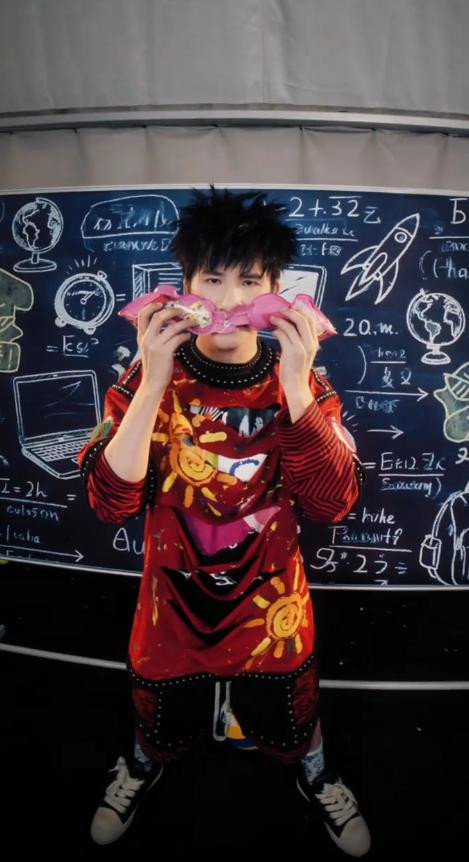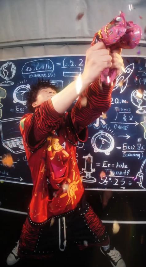 然后随着音乐的卡点,他举起了手里的彩片枪,并捏爆了它。