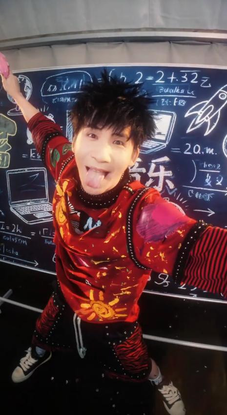大老师上身穿了一件很亮眼的红衣服,上面有许多的涂鸦。